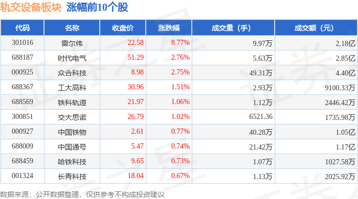 轨交设备板块市场表现 - 2023年12月29日,轨交设备板块整体上涨0.15%,表现略强于上证指数(上涨0.04%),但弱于深证成指(下跌0.49%)[1] - 板块内个股表现分化,九州一轨以5.40%的涨幅领涨,雷尔伟、威奥股份、通业科技涨幅均超过3.5%[1] - 同时有多只个股下跌,其中天宜上佳下跌2.91%,交大铁发下跌2.78%,时代电气下跌1.25%[2] 板块个股交易情况 - 涨幅居前的个股中,今创集团成交额最高,达到5.79亿元,成交量34.71万手[1] - 威奥股份成交量最大,为24.55万手,成交额1.92亿元[1] - 通业科技成交额达2.91亿元,雷尔伟成交额1.58亿元[1] - 下跌个股中,天宜上佳成交量最大,为38.50万手,成交额3.11亿元[2] - 众合科技成交额2.84亿元,永贵电器成交额2.70亿元,时代电气成交额2.01亿元[2] 板块资金流向 - 当日轨交设备板块整体呈现主力资金净流出7764.0万元,散户资金净流出333.42万元,但游资资金净流入8097.42万元[2] - 个股资金流向差异显著,今创集团主力资金净流入最多,达5352.61万元,占其成交额的9.24%[3] - 威奥股份主力资金净流入1779.25万元,占成交额9.25%[3] - 工大高科主力资金净流入967.42万元,占成交额8.66%[3] - 部分个股主力资金呈净流出状态,如研奥股份主力净流出2.98万元[3]