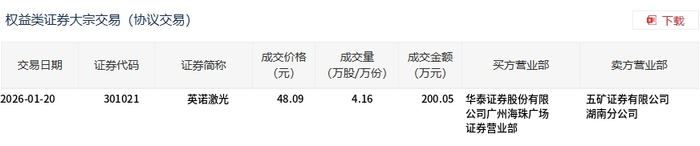 英诺激光大宗交易概况 - 2026年1月20日,英诺激光发生一笔大宗交易,成交4.16万股,成交金额为200.05万元,占该股当日总成交额的0.39% [1] - 该笔大宗交易的成交价格为48.09元,较当日市场收盘价55.96元折价14.06% [1] 交易细节 - 交易日期为2026年1月20日,证券代码为301021,证券简称为英诺激光 [2] - 成交价格为48.09元,成交量为4.16万股,成交金额为200.05万元 [2] - 买方营业部为华泰证券股份有限公司广州海珠广场证券营业部,卖方营业部为五矿证券有限公司湖南分公司 [2]