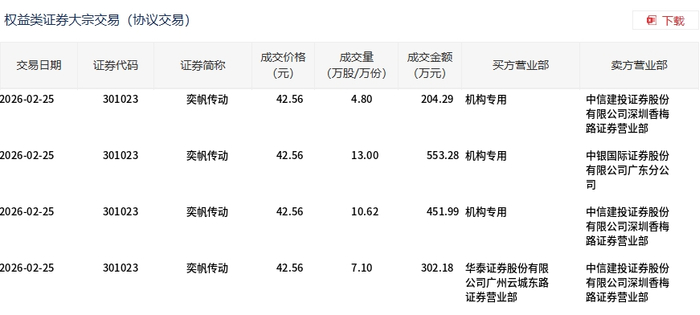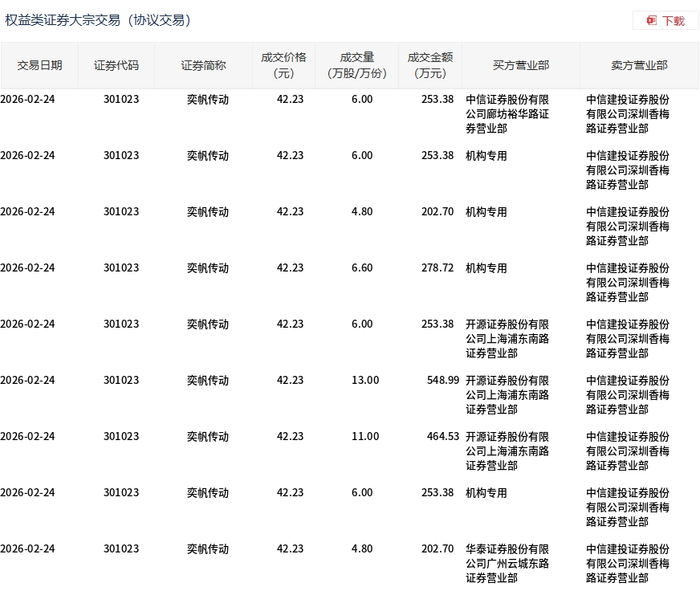 大宗交易概况 - 2026年2月24日,奕帆传动(301023)发生大宗交易,总成交量64.2万股,总成交额2711.16万元,占该股当日总成交额的27.39% [1] - 本次大宗交易统一成交价格为42.23元,较当日市场收盘价46.77元折价9.71% [1] 交易明细分析 - 本次大宗交易共分9笔完成,所有交易的卖方营业部均为中信建投证券股份有限公司深圳香梅路证券营业部 [2] - 买方构成包括机构专用席位以及多家券商的营业部,其中机构专用席位参与了4笔交易,合计买入28.4万股 [2] - 开源证券股份有限公司上海浦东南路证券营业部是最大的买方,通过3笔交易合计买入30万股,涉及金额1266.9万元 [2] - 其他买方包括中信证券股份有限公司廊坊裕华路证券营业部和华泰证券股份有限公司广州云城东路证券营业部 [2] - 单笔成交量在4.8万股至13万股之间,单笔成交额在202.70万元至548.99万元之间 [2]