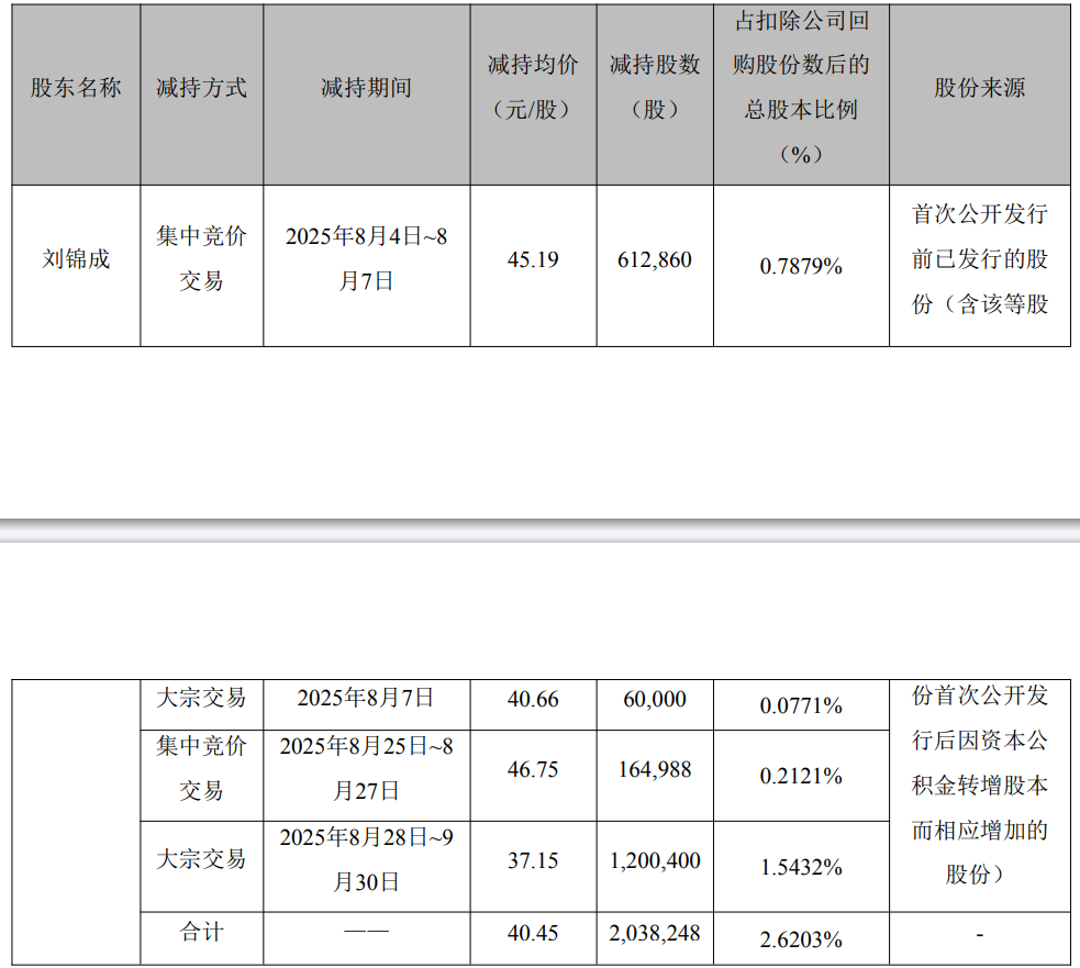 每经AI快讯,10月9日,江南奕帆公告,控股股东、实际控制人、董事长刘锦成在2025年8月4日至9月 30日期间,通过集中竞价和大宗交易方式合计减持公司股份203.8248万股,占扣除公司回购股份数后的 总股本比例的2.6203%。减持完成后,刘锦成持有公司股份3038.5752万股,占扣除公司回购股份数后的 总股本比例的39.0623%。此次减持符合相关法律法规及承诺。 ...