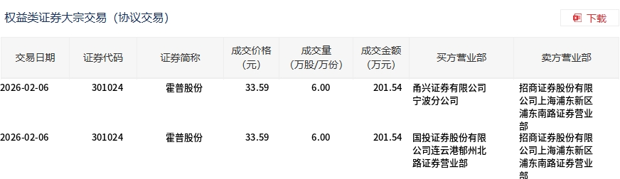 霍普股份大宗交易概况 - 2026年2月6日,霍普股份发生大宗交易,总成交量为12万股,总成交额为403.08万元,占该股当日总成交额的10.48% [1] - 本次大宗交易的成交价格为每股33.59元,较当日市场收盘价38.25元折价12.18% [1] 交易明细分析 - 当日共发生两笔大宗交易,每笔成交量均为6万股,成交额均为201.54万元,成交价格均为33.59元 [2] - 第一笔交易的买方为角兴证券有限公司宁波分公司,卖方为招商证券股份有限公司上海浦东新区油乐南路证券营业部 [2] - 第二笔交易的买方为国投证券股份有限公司连云港郁州北路证券营业部,卖方为招商证券股份有限公司上海浦东新区浦东南路证券营业部 [2]