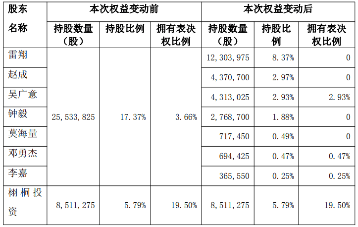 12月24日,华蓝集团(301027)发布公告,股东解除一致行动关系导致权益变动。原实际控制人雷翔、 赵成、吴广意、钟毅、莫海量、邓勇杰、李嘉于2025年7月14日签署了一致行动人协议,后因股份转让 与栩桐投资签署股份转让协议,决定解除一致行动协议。 2025年12月22日,相关股份完成过户登记,随即解除一致行动关系,各方持股数量及表决权不再合并计 算。 2025年前三季度,华蓝集团实现收入3.83亿元,归母净利润992万元。 | 本次权益变动前后,原实际控制人和栩桐投资的股份变化情况具体如下: | | --- | | 股东 | | 本次权益变动前 | | | 本次权益变动后 | | | --- | --- | --- | --- | --- | --- | --- | | 名称 | 持股数量 | 持股比例 | 拥有表决 | 持股数量 | 持股比 | 拥有表决 | | | (股) | | 权比例 | (股) | 例 | 权比例 | | 雷翔 | | | | 12, 303, 975 | 8. 37% | 0 | | 赵成 | | | | 4, 370, 700 | 2. 97% | 0 | | 吴广意 | | ...