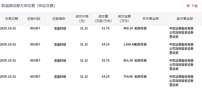 交易概况 - 2025年10月22日,显盈科技发生大宗交易,总成交量100万股,总成交额3112万元,占当日总成交额的18.17% [1] - 大宗交易成交价为31.12元,较市场收盘价34.22元折价9.06% [1] 交易明细分析 - 当日共发生4笔大宗交易,每笔成交价格均为31.12元 [2] - 4笔交易成交量分别为15.75万股、34.25万股、25.75万股和24.25万股,对应成交额分别为490.14万元、1065.8万元、801.34万元和754.66万元 [2] - 所有交易的买方营业部均为“机构专用” [2] - 所有交易的卖方营业部均为中信证券股份有限公司深圳宝安证券营业部 [2]