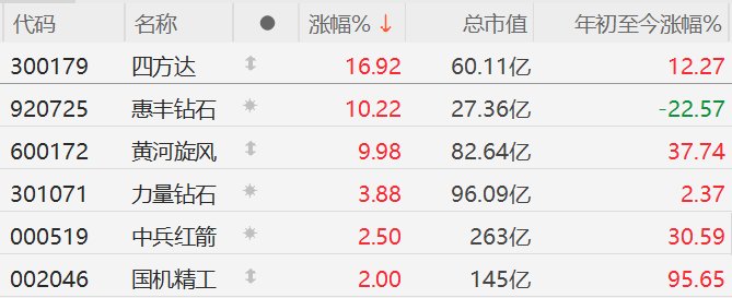中信证券研报称,10月9日商务部和海关总署对超硬材料相关物项实施出口管制,范围相比2024年8月扩 大,进一步凸显超硬材料的战略属性。尽管短期超硬材料企业可能出口受阻,但长期看本次出口管制会 加速国内超硬材料产业的整合,后市价格有望震荡上行,同时人造金刚石的功能性应用也有望持续催 化,看好超硬材料板块的交易性投资机会,建议关注龙头企业。 | 代码 | 名称 | 0 | 涨幅% ↓ | 总市值 | 年初至今涨幅% | | --- | --- | --- | --- | --- | --- | | 300179 | 四方达 | 1 | 16.92 | 60.11亿 | 12.27 | | 920725 | 惠韩钻石 | 兼 | 10.22 | 27.36亿 | -22.57 | | 600172 | 黄河旋风 | 1 | 9.98 | 82.64亿 | 37.74 | | 301071 | 力量钻石 | 兼 | 3.88 | 96.09亿 | 2.37 | | 000519 | 中兵红箭 | ﻨﺪ | 2.50 | 263亿 | 30.59 | | 002046 | 国机精工 | 1 | 2.00 | 145亿 ...