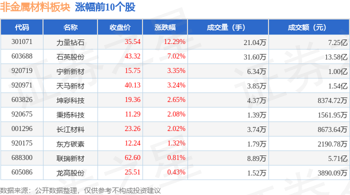 证券之星消息,10月9日非金属材料板块较上一交易日上涨3.15%,力量钻石领涨。当日上证指数报收于 3933.97,上涨1.32%。深证成指报收于13725.56,上涨1.47%。非金属材料板块个股涨跌见下表: | 代码 | 名称 | 收盘价 | 涨跌幅 | 成交量(手) | 成交额(元) | | | --- | --- | --- | --- | --- | --- | --- | | 301071 | 力量钻石 | 35.54 | 12.29% | 21.04万 | | 7.25亿 | | 603688 | 石英股份 | 43.32 | 7.02% | 31.60万 | | 13.58亿 | | 920719 | 宁新新材 | 15.75 | 3.35% | 6.34万 | | 1.00亿 | | 920971 | 天马新材 | 40.13 | 3.24% | - 3.85万 | | 1.54亿 | | 603826 | 坤彩科技 | 19.36 | 2.65% | 4.37万 | | 8374.72万 | | 920675 | 秉扬科技 | 11.29 | 2.08% | 1.39万 | | 1561. ...