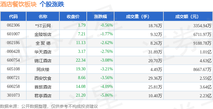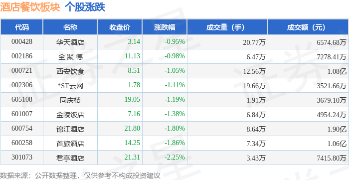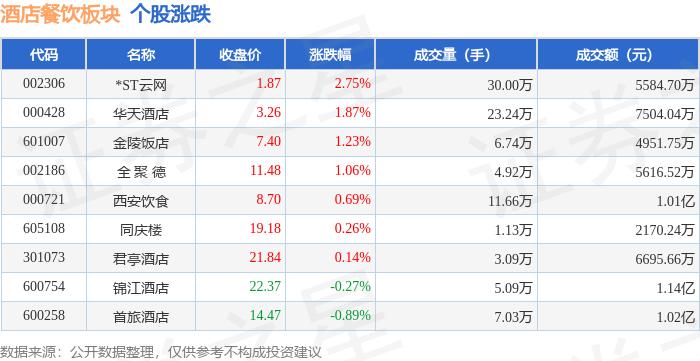 从资金流向上来看,当日酒店餐饮板块主力资金净流出4674.29万元,游资资金净流入1383.44万元,散户 资金净流入3290.85万元。酒店餐饮板块个股资金流向见下表: 证券之星消息,10月16日酒店餐饮板块较上一交易日下跌0.68%,*ST云网领跌。当日上证指数报收于 3916.23,上涨0.1%。深证成指报收于13086.41,下跌0.25%。酒店餐饮板块个股涨跌见下表: | 代码 | 名称 | 收盘价 | 涨跌幅 | 成交量(手) | 成交额(元) | | --- | --- | --- | --- | --- | --- | | 600754 | 锦江酒店 | 22.20 | -0.40% | 5.71万 | 1.27亿 | | 301073 | 君亭酒店 | 21.87 | -0.50% | 4.11万 | 9008.94万 | | 601007 | 金陵饭店 | 7.26 | -0.55% | 5.69万 | 4136.38万 | | 600258 | 首旅酒店 | 14.52 | -0.68% | - 5.65万 | 8228.95万 | | 605108 | 同庆楼 | 19.28 | -0 ...