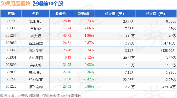 市场整体表现 - 2025年1月13日,文娱用品板块整体下跌1.09%,表现弱于大盘,当日上证指数下跌0.64%,深证成指下跌1.37% [1] - 板块内个股表现分化,在列出的20只股票中,6只上涨,14只下跌 [1][2] 领涨个股情况 - 创源股份领涨板块,收盘价28.10元,上涨3.73%,成交额6.65亿元,成交量23.77万手 [1] - 三柏硕上涨2.66%,收盘价17.74元,成交额1.25亿元 [1] - 康力源上涨1.96%,收盘价45.75元,成交额1.46亿元 [1] - 浙江自然上涨0.87%,收盘价24.31元,成交额5547.16万元 [1] 领跌个股情况 - 明月镜片领跌板块,收盘价43.32元,下跌3.99%,成交额2.46亿元 [2] - 群兴玩具下跌3.83%,收盘价6.53元,成交额2.55亿元 [2] - 实丰文化下跌3.72%,收盘价20.94元,成交额2.71亿元 [2] - 广博股份下跌3.16%,收盘价10.10元,成交额7.38亿元,成交量172.06万手为表中最高 [2] 板块资金流向 - 文娱用品板块整体呈现主力与游资净流出,散户净流入格局,主力资金净流出2.07亿元,游资资金净流出6800.74万元,散户资金净流入2.75亿元 [2] - 创源股份获得主力资金最大净流入,为3264.98万元,主力净占比4.91% [3] - 英派斯主力资金净流入1260.93万元,主力净占比4.94% [3] - 三柏硕主力资金净流入1181.41万元,主力净占比高达9.46% [3] - 天元宠物游资净流出最大,为1030.20万元,游资净占比-10.41%,同时散户净流入1046.15万元 [3]