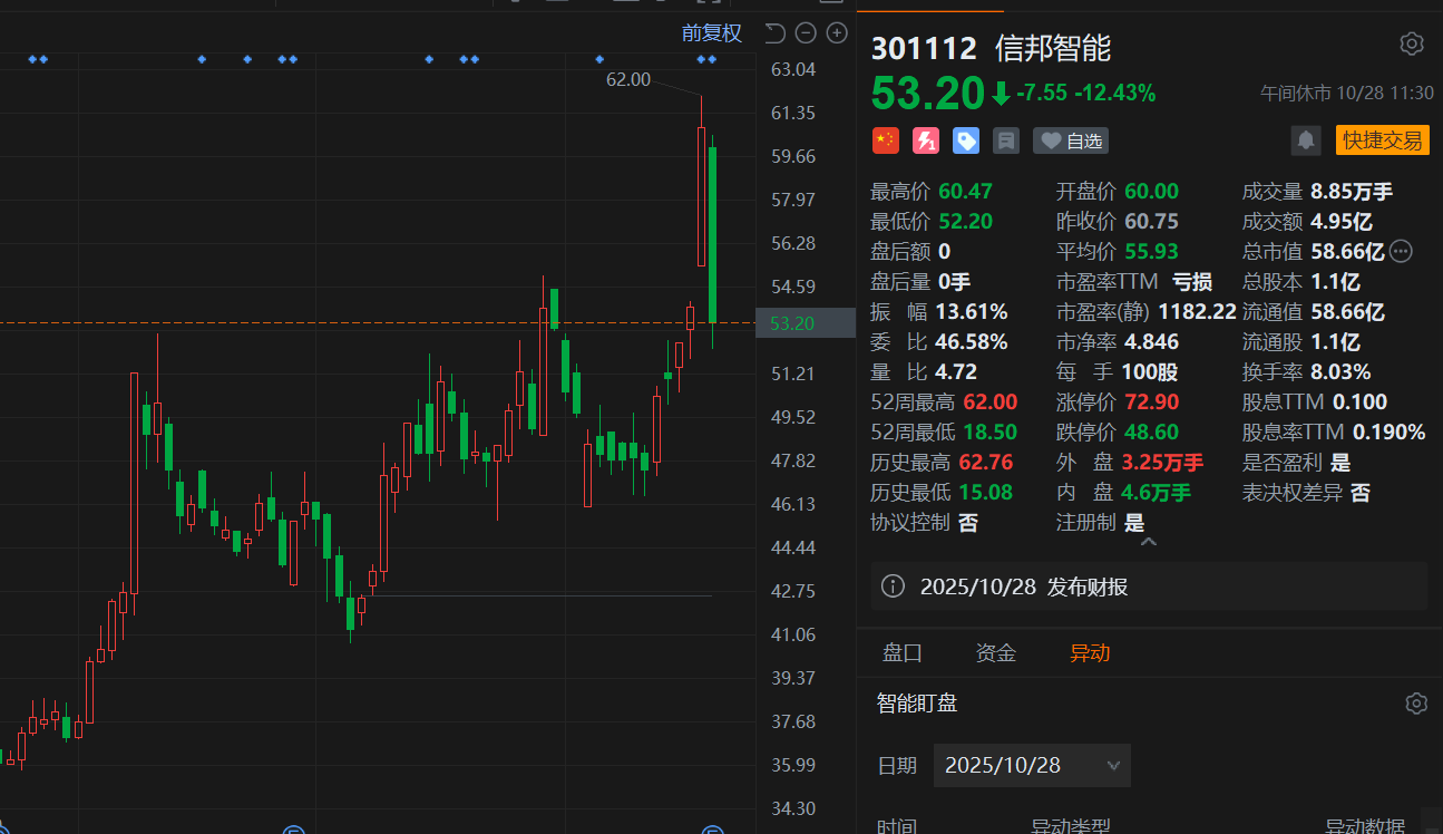 A股异动丨业绩下降,信邦智能大跌超12%,跌幅居市场首位