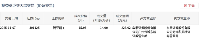 腾亚精工今日大宗交易折价成交14万股,成交额223.02万元