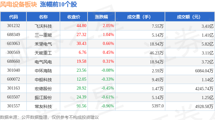 风电设备板块市场表现 - 11月4日风电设备板块整体下跌2.9%,表现弱于大盘,当日上证指数下跌0.41%,深证成指下跌1.71% [1] - 板块内个股表现分化,飞沃科技领涨,涨幅为2.05%,海力风电领跌,跌幅达7.51% [1][2] - 板块成交活跃,金风科技成交额最高,达25.03亿元,成交量为153.94万手 [2] 板块个股价格变动 - 涨幅居前的个股包括飞沃科技(+2.05%)、三一重能(+1.04%)和禾望电气(+0.66%) [1] - 跌幅显著的个股有海力风电(-7.51%)、威力传动(-6.85%)和大全重工(-6.72%) [2] - 明阳智能、运达股份和新强联跌幅均超过4% [2] 资金流向分析 - 风电设备板块整体呈现主力资金净流出8.75亿元,而游资和散户资金分别净流入1.81亿元和6.94亿元 [2] - 个股资金流向分化,禾望电气、振江股份和天能重工获得主力资金净流入,分别为1921.35万元、1273.75万元和1090.68万元 [3] - 海力风电遭遇主力资金和游资双双净流出,主力净流出3077.80万元,游资净流出4935.68万元 [3]