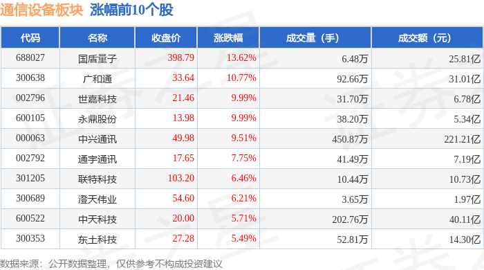 板块整体表现 - 通信设备板块在10月9日较上一交易日上涨0.54% [1] - 当日上证指数上涨1.32%至3933.97点,深证成指上涨1.47%至13725.56点 [1] - 板块资金流向呈现主力资金净流出8.04亿元和游资资金净流出4.53亿元,而散户资金净流入12.57亿元 [2] 领涨个股表现 - 国盾量子领涨板块,收盘价为398.79元,单日涨幅达13.62%,成交量为6.48万手,成交额为25.81亿元 [1] - 广和通涨幅为10.77%,收盘价33.64元,成交量为92.66万手,成交额为31.01亿元 [1] - 世嘉科技和永鼎股份均涨停,涨幅为9.99%,收盘价分别为21.46元和13.98元,成交额分别为6.78亿元和5.34亿元 [1] - 中兴通讯上涨9.51%,收盘价49.98元,成交量为450.87万手,成交额高达221.21亿元 [1] 下跌个股表现 - 剑桥科技领跌板块,跌幅为10.00%,收盘价115.02元,成交量为48.45万手,成交额为57.82亿元 [2] - 新易盛下跌4.00%,收盘价351.15元,成交量为52.29万手,成交额为188.91亿元 [2] - 有方科技、德科立、*ST精伦等个股跌幅在2.35%至4.22%之间 [2]