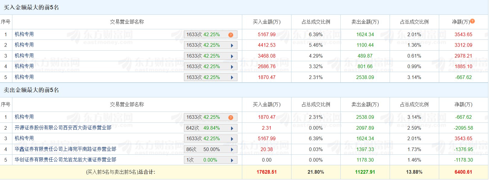 股价表现与交易概况 - 公司股票今日涨停,收盘价涨幅达20.00% [1] - 全天换手率为38.28%,成交额为6.00亿元,振幅为16.35% [1] - 近5日主力资金净流入3820.46万元 [2] 龙虎榜交易数据分析 - 上榜的前五大买卖营业部合计成交2.27亿元,买入1.13亿元,卖出1.14亿元,合计净卖出155.61万元 [2] - 机构专用席位表现活跃,共有7家现身,合计买入9292.85万元,卖出8629.02万元,净买入663.83万元 [2] - 营业部席位合计净卖出819.44万元 [1] 资金流向 - 今日主力资金净流入3175.61万元 [2] - 特大单资金净流入4144.33万元,大单资金净流出968.72万元 [2]
