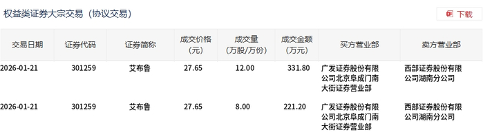 | 交易日期 | 证券代码 | 证券简称 | 成交价格 | 成交量 | 成交金额 | 买方营业部 | 卖方营业部 | | --- | --- | --- | --- | --- | --- | --- | --- | | | | | (元) | (万股/万份) | (万元) | | | | 2026-01-21 | 301259 | 艾布鲁 | 27.65 | 12.00 | 331.80 | 广发证券股份有限 | 西部证券股份有限 | | | | | | | | 公司北京阜成门南 | 公司湖南分公司 | | | | | | | | 大街证券营业部 | | | 2026-01-21 | 301259 | 艾布鲁 | 27.65 | 8.00 | 221.20 | 广发证券股份有限 | 西部证券股份有限 | | | | | | | | 公司北京阜成门南 | 公司湖南分公司 | | | | | | | | 大街证券营业部 | | | 权益类证券大宗交易(协议交易) | | --- | 1月21日,艾布鲁大宗交易成交20万股,成交额553万元,占当日总成交额的4.77%,成交价27.65元,较 市场收盘价34.6元 ...