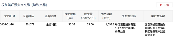 大宗交易概况 - 2026年1月16日,金道科技发生一笔大宗交易,成交量为33万股,成交额为1099.89万元,占该股当日总成交额的9.33% [1] - 该笔大宗交易的成交价格为33.33元,相较于当日市场收盘价34.01元,折价幅度为2% [1] 交易细节 - 该笔交易为权益类证券大宗交易(协议交易),证券代码为301279,证券简称为金道科技 [2] - 买方营业部为中信证券股份有限公司北京呼家楼证券营业部 [2] - 卖方营业部为国泰海通证券股份有限公司上海浦东新区陆家嘴东路证券营业部 [2]