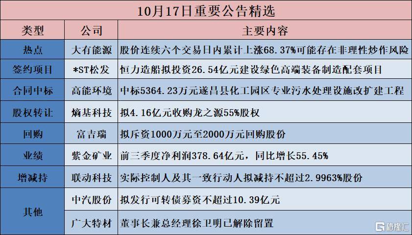 格隆汇公告精选︱紫金矿业:前三季度净利润378.64亿元,同比增长55.45%;广大特材:董事长兼总经理徐卫明已解除留置