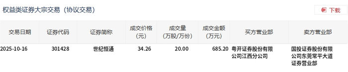 | 权益类证券大宗交易 (协议交易) | | | | | | | 印下 | | --- | --- | --- | --- | --- | --- | --- | --- | | 交易日期 | 证券代码 | 证券简称 | 成交价格 (元) | 成交量 (万股/万份) | 成交金额 (万元) | 买方营业部 | 卖方营业部 | | 2025-10-17 | 301428 | 世纪恒通 | 33.37 | 20.00 | | 667.40 粤开证券股份有限 | 国投证券股份有限 | | | | | | | | 公司江西分公司 | 公司东莞常平大道 | | | | | | | | | 证券型业部 | 10月17日,世纪恒通大宗交易成交20万股,成交额667.4万元,占当日总成交额的8.71%,成交价33.37 元,较市场收盘价33.88元折价1.51%。 ...
