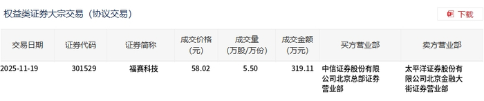 交易概况 - 2025年11月20日,福赛科技发生一笔大宗交易,成交量为5.5万股,成交金额为315.98万元,占当日总成交额的4.01% [1] - 成交价格为57.45元,相较于当日市场收盘价58.03元,折价1% [1] 交易细节 - 该笔交易的买方营业部为中信证券股份有限公司北京总部证券营业部,卖方营业部为太平洋证券股份有限公司北京金融大街证券营业部 [2] - 交易涉及的证券代码为301529,证券简称为福赛科技 [2]