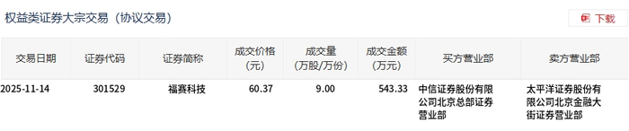 交易概况 - 2025年11月14日福赛科技发生一笔大宗交易,成交量为9万股,成交额为543.33万元[1] - 成交价格为60.37元,较当日市场收盘价60.98元折价1%[1] - 该笔交易占当日总成交额的4.72%[1] 交易细节 - 买方营业部为中信证券股份有限公司北京总部证券营业部[2] - 卖方营业部为太平洋证券股份有限公司北京金融大街证券营业部[2] - 证券代码为301529[2]