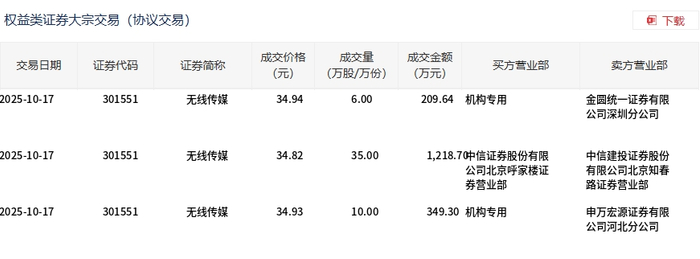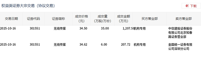 | 交易日期 | 证券代码 | 证券简称 | 成交价格 | 成交量 | 成交金额 | 买方营业部 | 卖方营业部 | | --- | --- | --- | --- | --- | --- | --- | --- | | | | | (元) | (万股/万份) | (万元) | | | | 2025-10-16 | 301551 | 无线传媒 | 34.50 | 35.00 | 1,207.5 机构专用 | | 中信建投证券股份 | | | | | | | | | 有限公司北京知春 | | | | | | | | | 路近旁营业部 | | 2025-10-16 | 301551 | 无线传媒 | 34.62 | 6.00 | 207.72 机构专用 | | 金圆统一证券有限 | | | | | | | | | 公司深圳分公司 | 10月16日,无线传媒大宗交易成交41万股,成交额1415.22万元,占当日总成交额的8.41%,成交均价 34.52元,较市场收盘价34.85元折价0.95%,其中最高成交价34.62元,最低成交价34.5元。 ...