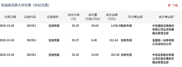 | 交易日期 | 证券代码 | 证券简称 | 成交价格 | 成交量 | 成交全额 (万元) | 买方营业部 | 卖方营业部 | | --- | --- | --- | --- | --- | --- | --- | --- | | | | | (元) | (万股/万份) | | | | | 2025-10-20 | 301551 | 无线传媒 | 35.20 | 30.00 | 1,056.0 机构专用 | | 中信建投证券股份 | | | | | | | | | 有限公司北京知春 | | | | | | | | | 路正券营业部 | | 2025-10-20 | 301551 | 无线传媒 | 35.27 | 6.00 | 211.62 机构专用 | | 金圆统一证券有限 | | | | | | | | | 公司深圳分公司 | | 2025-10-20 | 301551 | 无线传媒 | 35.25 | 10.00 | 352.50 机构专用 | | 中信证券股份有限 | | | | | | | | | 公司石家庄棵安东 | | | | | | | | | 路正在营业部 | 10月20日,无线传媒大宗交易成 ...