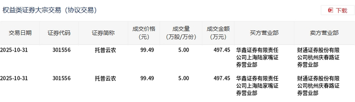交易概况 - 2025年10月31日托普云农发生大宗交易成交10万股成交额994.9万元占当日总成交额的3.79% [1] - 大宗交易成交价为99.49元较市场收盘价100.9元折价1.4% [1] 交易明细 - 当日共记录两笔大宗交易每笔成交量均为5万股成交金额均为497.45万元 [2] - 两笔交易的买方营业部均为华鑫证券有限责任公司上海陆家嘴证券营业部 [2] - 两笔交易的卖方营业部均为财通证券股份有限公司杭州庆春路证券营业部 [2]