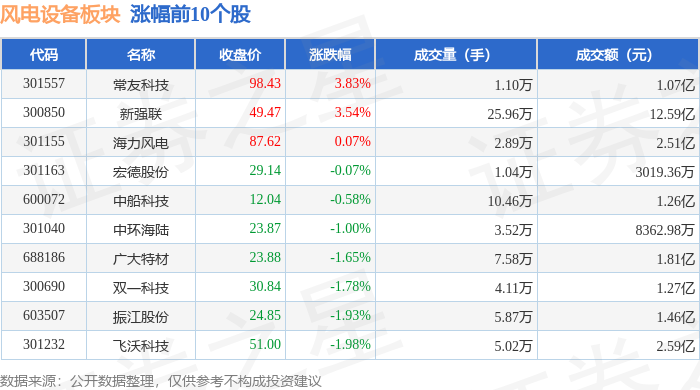 证券之星消息,11月12日风电设备板块较上一交易日下跌2.86%,禾望电气领跌。当日上证指数报收于 4000.14,下跌0.07%。深证成指报收于13240.62,下跌0.36%。风电设备板块个股涨跌见下表: | 代码 | 名称 | 收盘价 | 涨跌幅 | 成交量(手) | 成交额(元) | | | --- | --- | --- | --- | --- | --- | --- | | 301557 | 常友科技 | 98.43 | 3.83% | 1.10万 | | 1.07亿 | | 300850 | 新强联 | 49.47 | 3.54% | 25.96万 | | 12.59 Z | | 301155 | 海力风电 | 87.62 | 0.07% | 2.89万 | | 2.51亿 | | 301163 | 宏德股份 | 29.14 | -0.07% | 1.04万 | | 3019.36万 | | 600072 | 中船科技 | 12.04 | -0.58% | 10.46万 | | 1.26亿 | | 301040 | 中环海陆 | 23.87 | -1.00% | 3.52万 | | 8362.9 ...