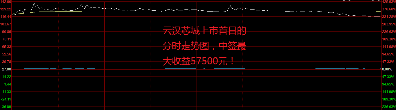 就在上市钟声敲响前,中签云汉芯城的股民们或许还曾有过一丝忐忑:万一破发怎么办?但这份担忧,随着开盘那一刻的"火箭发射",瞬间化为乌有,取而 代之的是抑制不住的兴奋与狂喜。 120元!开盘价一出,中签的股民恐怕早就藏不住笑了。相比27元的发行价,足足暴涨344.4%,这哪是上市,简直是"空降财富"。对于中签者而言,这根本 不是一场投资,而是一次"天上掉馅饼"的幸运暴击。按每签500股计算,开盘即卖就能稳稳落袋46,500元——这可不是年中分红,而是短短一秒钟内凭中签 资格换来的真金白银,堪称一只新股肉签。 | 142.00 | | | | --- | --- | --- | | 129.22 | 11 | | | 116.44 | | | | 103.67 | | | | 90.89 | | 云汉芯城上市首日的 | | 78.11 | | | | 65.33 | | 分时走势图,中签最 | | 52.56 | | | | 39.78 | | 大收益57500元 ! | | 27.00 | | | | 14.22 | | | | 1.44 | | | | -11.33 | | | | -24.11 | | | | ...
