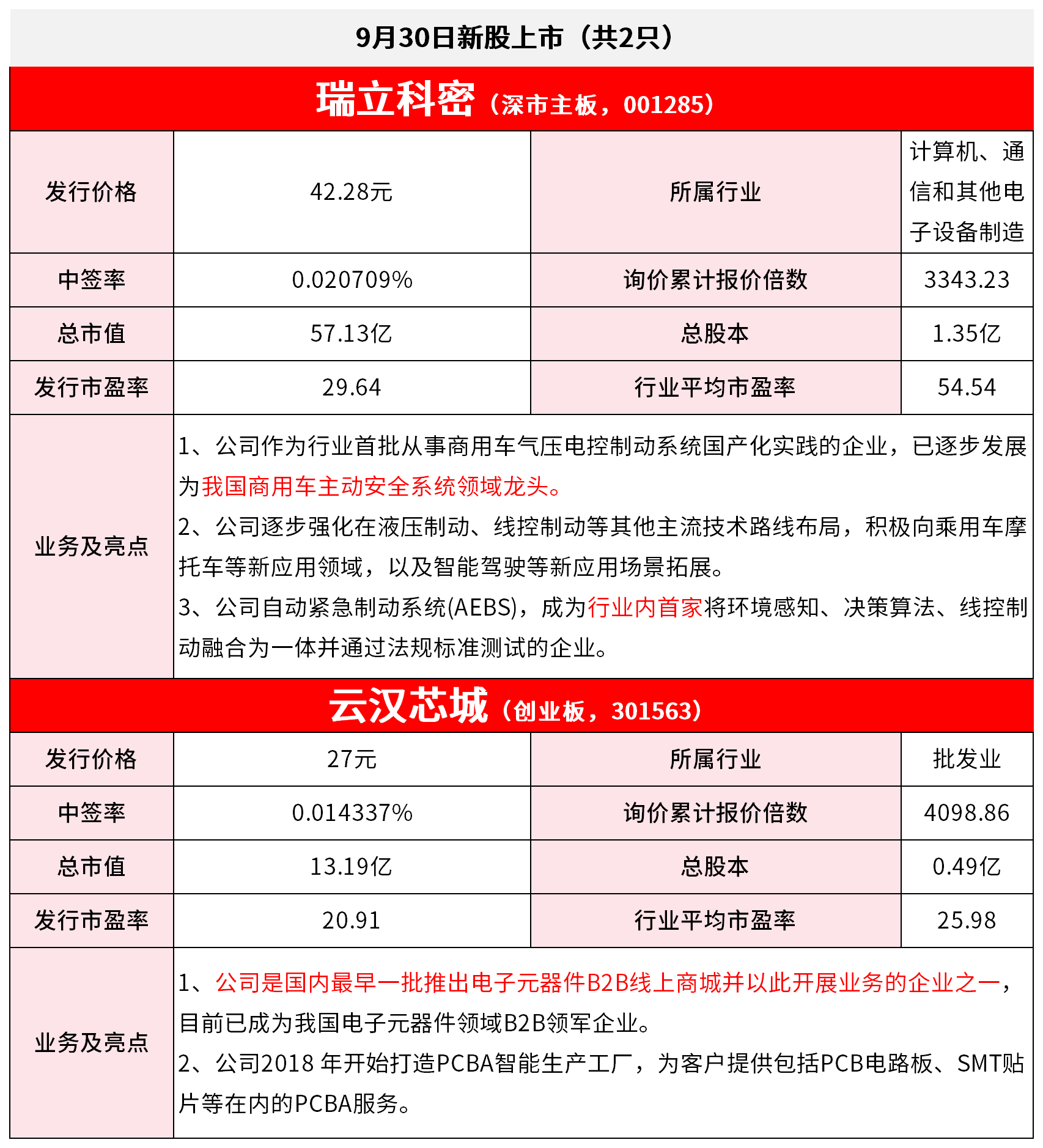 *免责声明:文章内容仅供参考,不构成投资建议 *风险提示:股市有风险,入市需谨慎 9月30日新股上市(共2只) | | 瑞立科密(深市主板,0012 | | | --- | --- | --- | | 发行价格 | 42.28元 | | | 留签率 | 0.020709% | 询价 | | 总市值 | 57.13亿 | | | 发行市盈率 | 29.64 | 行业 | | | 公司作为行业首批从事商用车气压电控制动系 为我国商用车主动安全系统领域龙头。 | | | 业务及亮点 | 2、公司逐步强化在液压制动、线控制动等其他主 | | | | 托车等新应用领域,以及智能驾驶等新应用场景 | | | | 3、公司自动紧急制动系统(AEBS),成为行业内官 | | | | 动融合为一体并通过法规标准测试的企业。 | | | | 云汉芯城(创业板,3015 | | | 发行价格 | 27元 | | | 中签率 | 0.014337% | 询价 | | 总市值 | 13.19亿 | | | 发行市盈率 | 20.91 | 行业 | ...