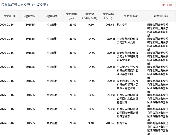 1月16日,中仑新材大宗交易成交96万股,成交额2056.32万元,占当日总成交额的12.14%,成交价 21.42元,较市场收盘价25.57元折价16.23%。 | 交易日期 | 证券代码 | 证券简称 | 成交价格 | 成交量 | 成交全额 买方营业部 | 卖方营业部 | | --- | --- | --- | --- | --- | --- | --- | | | | | (元) | (万股/万份) | (万元) | | | 2026-01-16 | 301565 | 中仑新材 | 21.42 | 9.60 | 205.63 机构专用 | 国泰海通证券股份 | | | | | | | | 有限公司上海长宁 | | | | | | | | 区江苏路证券营业 | | | | | | | | ਵੀ | | 2026-01-16 | 301565 | 中仑新材 | 21.42 | 14.00 | 299.88 中信证券股份有限 | 国泰海通证券股份 | | | | | | | 公司苏州分公司 | 有限公司上海长宁 | | | | | | | | 区江苏路证券营业 | | | | | | | | 章 | | 20 ...