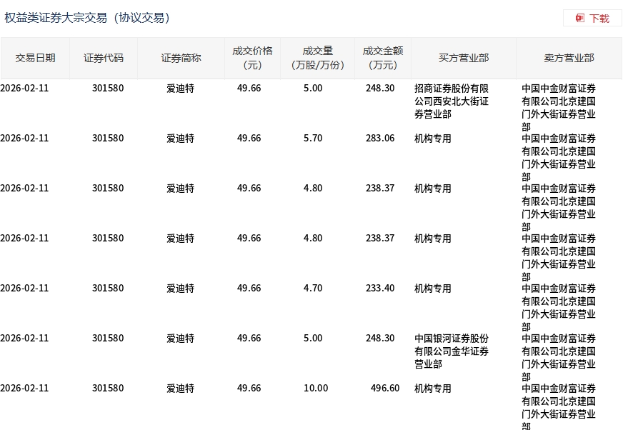 爱迪特大宗交易概况 - 2026年2月11日,爱迪特发生大宗交易,总成交40万股,总成交额1986.4万元,占该股当日总成交额的7.34% [1] - 本次大宗交易成交价为49.66元,较当日市场收盘价55.18元折价10% [1] 交易明细分析 - 当日共发生7笔大宗交易,所有交易成交价均为49.66元,卖方营业部均为中国中金财富证券有限公司北京建国门外大街证券营业部 [2] - 买方构成包括机构专用席位和券商营业部,其中机构专用席位参与了4笔交易,合计成交25.2万股,金额约1251.23万元 [2] - 具体交易明细:第一笔成交5万股,金额248.30万元,买方为招商证券西安北大街营业部 [2];第二笔成交5.7万股,金额283.06万元,买方为机构专用 [2];第三笔成交4.8万股,金额238.37万元,买方为机构专用 [2];第四笔成交4.8万股,金额238.37万元,买方为机构专用 [2];第五笔成交4.7万股,金额233.40万元,买方为机构专用 [2];第六笔成交5万股,金额248.30万元,买方为中国银河证券金华营业部 [2];第七笔成交10万股,金额496.60万元,买方为机构专用 [2]