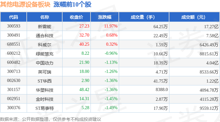 证券之星消息,10月30日其他电源设备板块较上一交易日下跌2.4%,中恒电气领跌。当日上证指数报收 于3986.9,下跌0.73%。深证成指报收于13532.13,下跌1.16%。其他电源设备板块个股涨跌见下表: 从资金流向上来看,当日其他电源设备板块主力资金净流出22.27亿元,游资资金净流入4.87亿元,散户 资金净流入17.4亿元。其他电源设备板块个股资金流向见下表: | 代码 | 名称 | 收盘价 | 涨跌幅 | 成交量(手) | 成交额(元) | | --- | --- | --- | --- | --- | --- | | 002364 | 中恒电气 | 25.60 | -8.05% | 62.19万 | 16.33亿 | | 300870 | 欧陆通 | 206.40 | -6.39% | 7.68万 | 16.39 7 | | 002851 | 麦格米特 | 75.87 | -5.48% | 32.16万 | 24.92亿 | | 300820 | 英杰电气 | 52.66 | -4.53% | 5.75万 | 3.08亿 | | 301590 | 优优绿能 | 179.67 | -4.38% ...