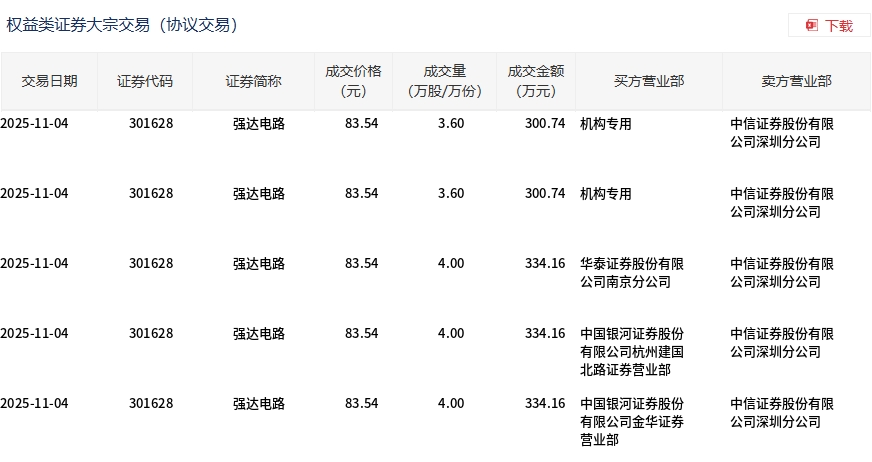 交易概况 - 强达电路于2025年11月4日发生大宗交易,总成交量19.2万股,成交总额1603.96万元,占当日总成交额的4.78% [1] - 成交价格为83.54元,较市场收盘价92.81元折价9.99% [1] 交易明细 - 当日共发生5笔大宗交易,每笔成交价格均为83.54元 [2] - 其中3笔交易由“机构专用”席位作为买方,合计成交10.8万股,金额902.22万元 [2] - 另外2笔交易的买方分别为华泰证券南京分公司和中国银河证券的两家营业部,合计成交8万股,金额668.32万元 [2] - 所有5笔交易的卖方均为中信证券深圳分公司 [2]