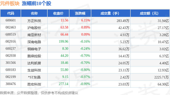 元件板块整体市场表现 - 11月19日元件板块整体下跌1.16%,而同日上证指数上涨0.18%,深证成指基本持平[1] - 板块内个股表现分化,领涨股为方正科技,上涨6.15%,领跌股为强达电路,下跌8.04%[1][2] - 板块主力资金净流出14.58亿元,但游资和散户资金分别净流入1.22亿元和13.36亿元[2] 领涨个股表现 - 方正科技收盘价11.56元,涨幅6.15%,成交量为283.49万手,成交额达31.94亿元[1] - 沪电股份收盘价63.58元,上涨0.89%,成交量为42.43万手,成交额为27.17亿元[1] - 南亚新材收盘价66.44元,微涨0.09%,成交量为4.93万手,成交额为3.28亿元[1] 领跌个股表现 - 强达电路收盘价83.96元,跌幅达8.04%,成交量为2.69万手,成交额为2.33亿元[2] - 高华科技收盘价33.13元,下跌7.35%,成交量为5.07万手,成交额为1.72亿元[2] - 超颖电子收盘价76.78元,下跌6.82%,成交量为10.77万手,成交额为8.44亿元[2] 个股资金流向 - 方正科技主力资金净流入3.28亿元,净占比10.26%,但游资和散户资金分别净流出2510.93万元和3.02亿元[3] - 沪电股份主力资金净流入1999.90万元,净占比0.74%,游资净流入3531.84万元,散户净流出5531.74万元[3] - 威尔高主力资金净流入1725.81万元,净占比7.65%,游资净流入787.76万元,散户净流出2513.57万元[3]