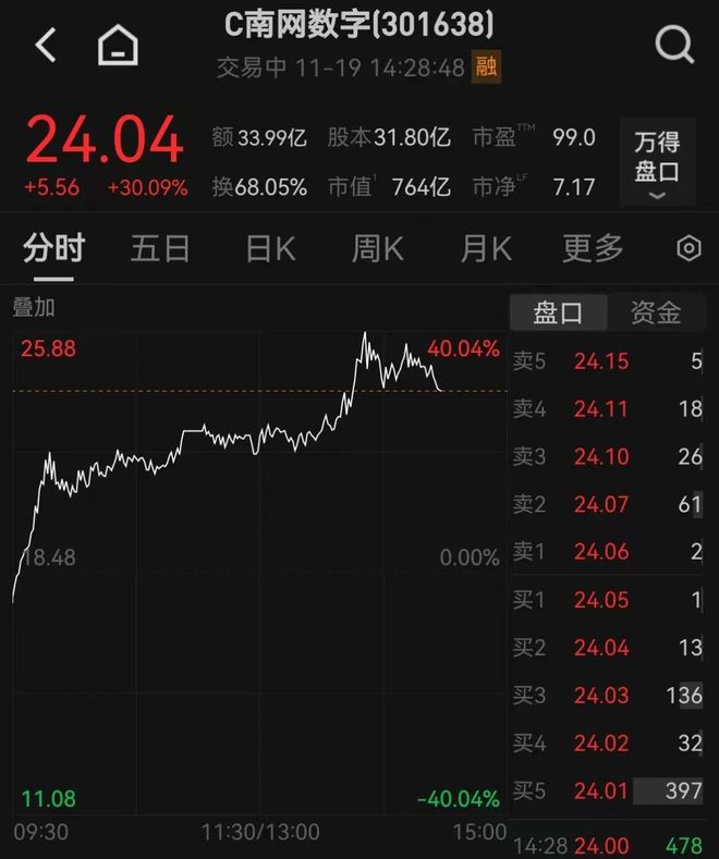 11月19日,次新股C南网数字午后涨超30%,该股早盘一度触发临停。 编辑丨瑜见 11月18日,南方电网数字电网研究院股份有限公司在深交所正式挂牌上市, 上市首日开盘涨261.51%,截至收盘涨幅回落至224.78%。 ...
