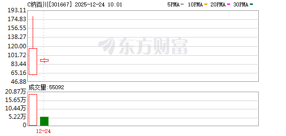 人民财讯12月24日电,C纳百川(301667)上市首日上涨408.17%,当日融资买入额为5107.20万元,占该 股全天交易额的3.51%,最新融资余额为4620.54万元,占流通市值的比例为1.79%。 ...