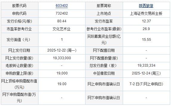 陕西旅游文化产业股份有限公司 陕西旅游2025年12月18日披露的首次公开发行股票并在主板上市招股说明书显示,公司拟募资 155,512.79万元,用于建设类项目、收购类项目。 陕西旅游2025年12月19日披露的首次公开发行股票并在主板上市发行公告显示,按本次发行价格80.44 元/股和1,933.3334万股的新股发行数量计算,若本次发行成功,预计公司募集资金总额约155,517.34万 元,扣除约3,324.65万元(不含增值税)的发行费用后,预计募集资金净额152,192.69万元。 苏州市新广益电子股份有限公司 保荐机构(主承销商):中信证券股份有限公司 保荐机构(主承销商):中国国际金融股份有限公司 发行情况: | 股票代码 | 603402 | 股票简称 | 陕西旅游 | | --- | --- | --- | --- | | 申购代码 | 732402 | 上市地点 | 上海证券交易所主板 | | 发行价格(元假) | 80.44 | 友行市盈率 | 12.37 | | 市盈率参考行业 | 文化艺术业 | 参考行业市盈率(最新) | 26.9 | | 发行面值(元) | 1 | 实际募集资金总 ...