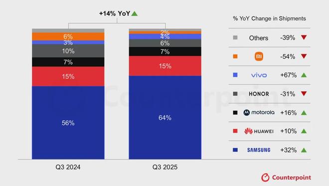 12月3日,市场调研机构Counterpoint Research最新发布的折叠屏智能手机市场追踪报告显示,2025年三 季度,全球折叠屏智能手机出货量同比增长14%,创下该品类出货量的季度历史新高。 分品牌来看,三星迎来强势反弹,Q3出货量占比高达64%,领跑全球折叠屏市场,出货量较去年同期 增长32%;华为以15%的份额位居第二,同比增长10%;摩托罗拉当季出货量为7%,同比增长16%,排 名第三。此外,荣耀、vivo、小米分列第四至第六,其中vivo增长67%,小米折叠屏出货量较去年同期 出现较大下滑,同比下降54%。 该机构还提到,2026年,市场将进入更显著的扩张阶段。其主要推动因素包括耐用性的提升、机身进一 步变薄变轻、铰链和面板结构的优化,以及更丰富的AI驱动软件体验。作为2026年下半年的重要新入 局者,苹果预计将凭借庞大的iPhone用户基础,在核心市场推动新一轮高端产品的升级周期。 随着竞争格局的重塑,技术创新领导力的重要性进一步凸显,促使现有厂商加速布局多形态产品,并为 下一波折叠屏的普及提前准备。 在苹果入局前,各大智能手机品牌正更加积极地强化技术领先优势,并深化产品差异化策略。其中一 ...