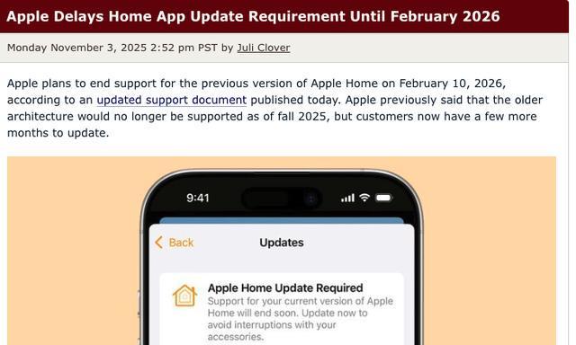 苹果HomeKit架构升级再延期:旧版系统停用时间推迟至2026年2月