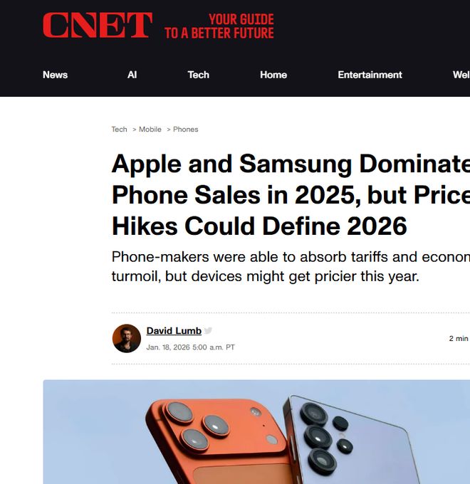 苹果三星领跑2025手机市场,2026年涨价或成定局