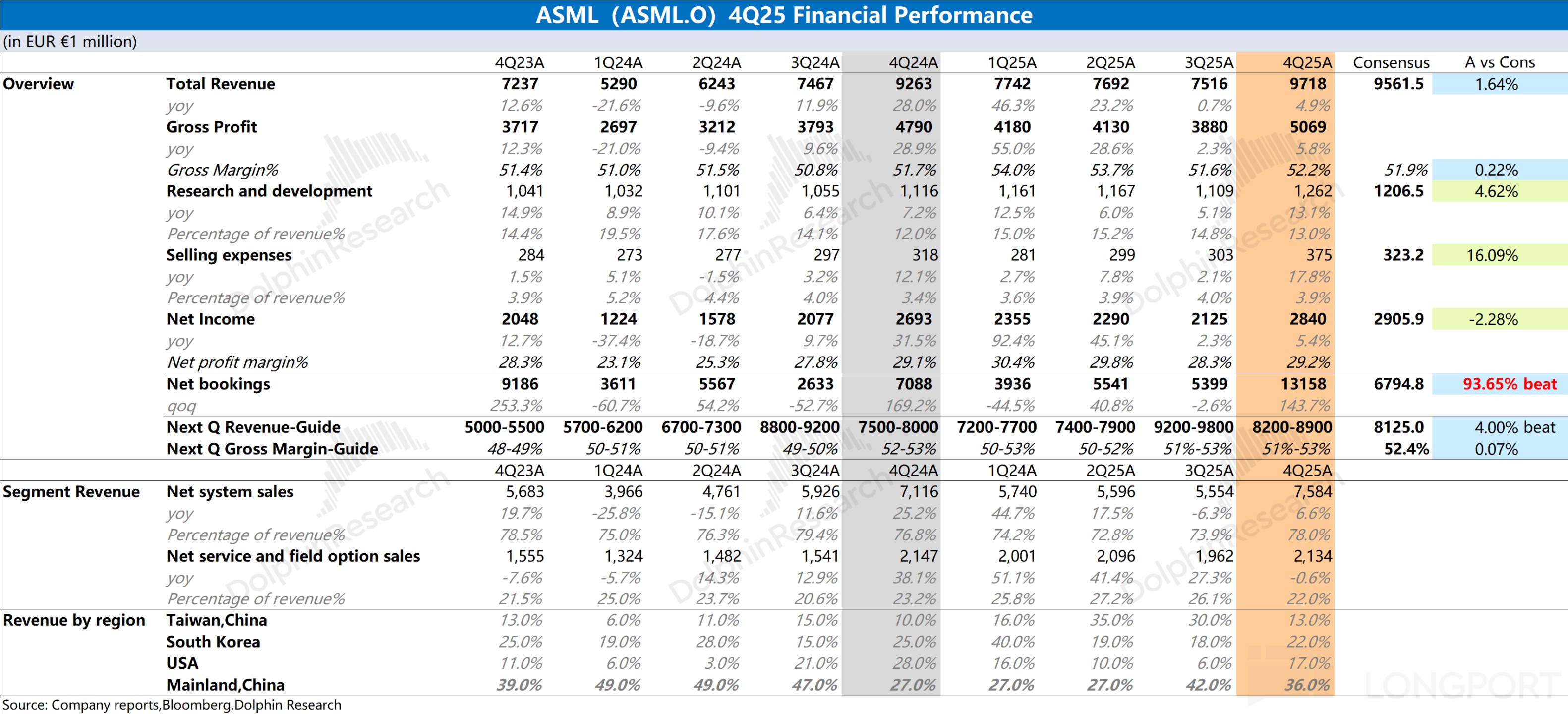 纪要涉及的行业或公司 * 公司为阿斯麦(ASML),主营业务为光刻机等半导体设备制造与相关服务[1] * 行业为半导体设备制造行业[1] 核心观点与论据 **财务表现强劲,营收与毛利率超预期** * 公司25Q4营收97.2亿欧元,环比增长29%,处于公司指引上沿,且高于彭博一致预期的95.7亿欧元[1] * 公司25Q4毛利率52.2%,环比提升0.6个百分点,高于公司指引中值及彭博一致预期的51.9%[1] * 公司25Q4净利润28.4亿欧元,环比增长34%,但略低于彭博一致预期的29.1亿欧元[1] **未来业绩指引积极,营收展望上调** * 公司预计26Q1营收82-89亿欧元,高于彭博一致预期的81.3亿欧元[1] * 公司预计2026年营收340-390亿欧元,指引中值高于彭博一致预期的351亿欧元,且公司此前指引仅为2026年营收不低于2025年,此次给出了具体且积极的增长目标[1][2] * 公司对26Q1及2026年的毛利率指引均为51%-53%,但指引中值均略低于彭博一致预期[1][2] **营收结构:设备销售驱动增长,EUV贡献近半** * 25Q4设备收入76亿欧元,环比大幅增长37%,服务收入21亿欧元,环比增长9%[3] * 设备销售中,EUV销量14台,环比增加5台,其收入贡献占比高达48%[3] * ArFi DUV销量37台,环比减少1台,收入占比40%[3] * 其他DUV和检测量测机台销量51台,环比大幅增加26台,收入占比12%[3] **下游需求:逻辑芯片占主导,存储订单强劲** * 25Q4设备收入按下游应用拆分,逻辑收入占比70%,存储收入占比30%[3] * 从新签订单看,存储订单占比56%,逻辑订单占比44%,显示存储领域需求强劲[4] **新签订单创纪录,预示未来增长动能** * 公司25Q4新签订单金额高达132亿欧元,环比大幅增加77.6亿欧元[5] * 按产品拆分,EUV新签订单74亿欧元(环比+38亿欧元),DUV新签订单58亿欧元(环比+40亿欧元),两大产品线订单均大幅增长[5] 其他重要内容 * 公司业绩指引中,对26Q1及2026年的毛利率预期范围(51%-53%)保持一致,但市场对长期毛利率的预期(52.9%)高于公司指引中值[1][2] * 设备销量数据显示,除核心的EUV和ArFi DUV外,其他DUV及检测量测机台销量环比增长显著(+26台),但收入占比较低(12%)[3]
