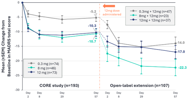文章核心观点 - AtaiBeckley公司宣布其药物BPL-003在治疗抵抗性抑郁症(TRD)的2b期临床试验开放标签扩展研究中取得积极顶线结果,显示12毫克剂量在初始给药八周后再次给药具有良好的耐受性,并能产生额外、快速且持久的抗抑郁效果,效果可持续长达八周[1] - 公司计划在与美国FDA进行2期结束会议后,将BPL-003推进至3期临床试验,目标是在2026年第二季度启动3期试验[2][9] 临床试验设计与患者入组 - 2b期临床试验分为两部分:为期八周的四盲剂量探索核心研究,评估单次0.3毫克、8毫克或12毫克BPL-003在TRD患者中的疗效和安全性;随后是为期八周的开放标签扩展研究,评估在初始剂量八周后给予第二次12毫克剂量的安全性和疗效[2] - 在完成盲法核心研究并有资格入组的126名患者中,有107名进入了扩展研究[2] 顶线疗效结果 - 在2b期临床试验核心研究中接受活性剂量(8毫克或12毫克)BPL-003的患者,在开放标签扩展研究中接受12毫克剂量后,抑郁应答和缓解率提高,在扩展研究第8周(2b期临床试验第16周)时,应答率为63%,缓解率为48%[4] - 核心研究中初始接受0.3毫克剂量的患者(n=47),在扩展研究第57天时MADRS评分较核心研究基线平均降低14.0分[8] - 核心研究中初始接受8毫克剂量的患者(n=23),在扩展研究第57天(2b期临床试验第16周)时MADRS评分较基线平均降低22.3分,同期应答率为81%,缓解率为67%[8] - 核心研究中接受活性剂量(8毫克或12毫克)的合并患者群体(n=60),在扩展研究第57天时MADRS评分较基线平均降低19.0分,同期应答率为63%,缓解率为48%[8] 顶线安全性结果 - BPL-003的安全性和耐受性特征与既往研究基本一致,与已报道的致幻类药物研究相符,总体耐受性良好[8] - 大多数不良事件发生在给药当天,严重程度为轻度或中度,且具有短暂性[8] - 最常见的不良反应包括恶心、头痛、给药部位疼痛、给药部位不适、血压升高和焦虑[8] - 研究报告了一例与药物相关的严重不良事件,发生在第二次给药后8天,通过额外的住院监测和支持后得到解决[8] - 平均达到符合出院准备标准的时间在给药后2小时内,支持BPL-003适应现有介入性精神病学治疗模式的潜力[8] 药物与监管进展 - BPL-003是一种专利保护的甲氧福汀苯甲酸盐鼻喷雾剂专有制剂[12] - 美国FDA已授予BPL-003用于治疗抵抗性抑郁症的突破性疗法认定[4] - 公司已安排与FDA进行2期结束会议,以就3期临床试验设计及其他开发计划方面达成一致,预计在2026年第一季度提供3期临床计划的指导[4][9] 疾病背景与市场机会 - 抑郁症是一种致残性且改变生活的疾病,全球有近3亿人受影响[11] - 治疗抵抗性抑郁症是指个体对两种或以上抗抑郁药物治疗无效,可能影响高达50%的抑郁症患者,表明对更有效疗法存在显著未满足需求[11] - TRD与非抵抗性抑郁症相比,伴有更高的共病焦虑、性功能障碍、认知障碍发生率,并导致生活质量下降,给患者、护理人员和医疗系统带来沉重负担[11] 公司管线与战略 - AtaiBeckley是一家临床阶段生物制药公司,致力于通过开发有效、快速起效且便捷的精神健康疗法来改善患者结局[13] - 公司由atai Life Sciences和Beckley Psytech Limited于2025年11月战略合并而成[13] - 公司研发管线包括用于TRD的BPL-003、用于TRD的VLS-01以及用于社交焦虑障碍的EMP-01,这些项目均处于2期临床开发阶段[13] - 公司还推进一项药物发现项目,旨在识别用于阿片类药物使用障碍和TRD的新型非致幻性5-HT2AR激动剂[13]