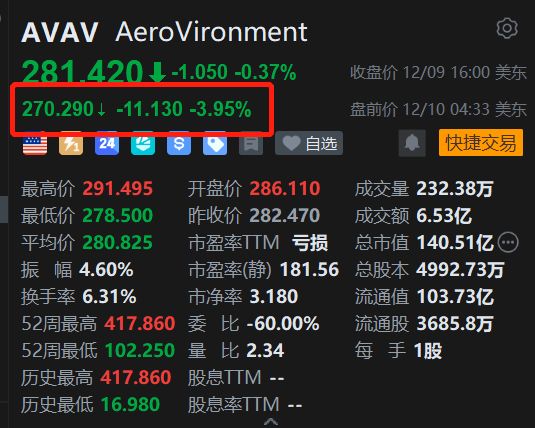 AeroVironment(AVAV.US)盘前跌近4%报270.29美元。消息上,AeroVironment公布了截至2025年11月1日 的2026财年Q2财务业绩。第二季度营收创下4.725亿美元的历史纪录,同比增长151%;其财政第二季度 调整后每股收益为0.44美元,低于一年前的0.47美元。该公司预计全年调整后每股收益为3.40至3.55美 元,收入为19.5亿至20亿美元。此前的指引为调整后每股收益3.60至3.70美元,收入为19亿至20亿美 元。 | AVAV AeroVironment | | | | --- | --- | --- | | 281 420 ↓ -1.050 -0.37% | | 收盘价 12/09 16:00 美东 | | 270.290 + -11.130 -3.95% | | 盘前价 12/10 04:33 美东 | | 三 2 2 | | ● 快捷交易 | | 最高价 291.495 | 开盘价 286.110 | 成交量 232.38万 | | 最低价 278.500 | 昨收价 282.470 | 成交额 6.53亿 | | 平均价 280.825 | 市盈率T ...