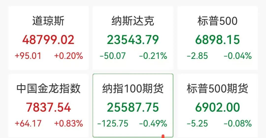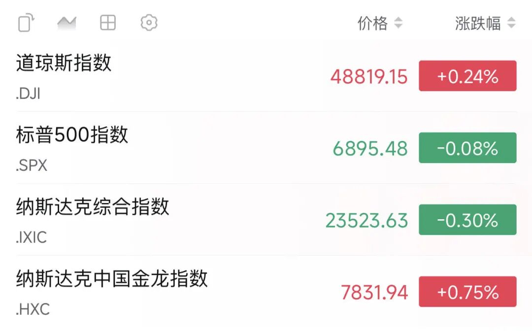道指新高。 不过,多数华尔街投行依然维持此前判断,认为美联储明年将降息两次,累计降息50个基点。 花旗集团预计,受疲软的劳动力市场数据支撑,美联储将在明年1月和3月分别降息;摩根士丹利预测降息时点为明年1月和4月。 高盛、富国银行和巴克莱的策略师们也认为,美联储明年将降息两次,3月和6月是可能降息的月份。 当地时间12月12日(周五),美股三大股指走势分化,道指创下历史新高。截至发稿,道指涨0.24%,标普500指数跌0.08%,纳指跌0.3%。 | 0 | △ 田 03 | 价格 = | 涨跌幅 ◆ | | --- | --- | --- | --- | | 道琼斯指数 | | 48819.15 | +0.24% | | .DJI | | | | | 标普500指数 | | 6895.48 | -0.08% | | .SPX | | | | | 纳斯达克综合指数 | | 23523.63 | -0.30% | | .IXIC | | | | | 纳斯达克中国金龙指数 | | 7831.94 | +0.75% | | IIVA | | | | 消息面上,周五,多位美联储官员发声。美联储施密德表示,劳动力市场正 ...