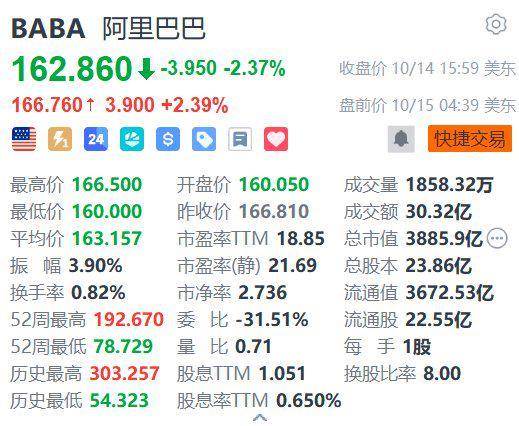 阿里巴巴(BABA.US)盘前涨2.39%报166.76美元。消息面上,天猫双11今晚8点正式开启。今年天猫双11 官方立减85折基础上,再叠加9折消费券、行业品类券、购物金等。88VIP迎来史上最大3250元券包, 含1350元无门槛9折消费券。(格隆汇) | BABA 阿里巴巴 | | | | --- | --- | --- | | 162.860 4 -3.950 -2.37% | | 收盘价 10/14 15:59 美东 | | 166.760 * 3.900 +2.39% | | 盘前价 10/15 04:39 美东 | | 壁 5 24 4 5 5 5 5 5 5 9 | | ● 快捷交易 | | 最高价 166.500 | 开盘价 160.050 | 成交量 1858.32万 | | 最低价 160.000 | 昨收价 166.810 | 成交额 30.32亿 | | 平均价 163.157 | 市空室 M 18.85 | 总市值 3885.9亿 (…) | | 振 幅 3.90% | 市盈率(静) 21.69 | 总股本 23.86亿 | | 换手率 0.82% | 市净率 2.736 | 流 ...