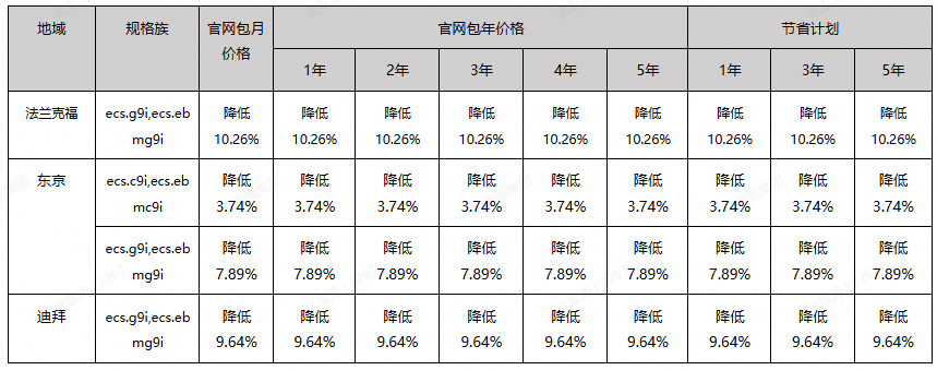 根据公告,此次调价产品的规格族包括ecs.c9i、ecs.g9i、ecs.r9i、ecs.ebmc9i、ecs.ebmg9i、ecs.ebmr9i,阿里云对相应产品 的包月价、包年价格及节省计划进行了普降,以ecs.g9i产品为例,该产品在法兰克福降价10.26%,在东京降价7.89%,迪 拜降价9.64%。 尽管本次降价的范围并不大,但能够从中窥见阿里云进攻海外市场的野心。 阿里云再度开启了海外市场的降价攻势。 阿里云官网公告显示,自北京时间10月30日起,阿里云部分云服务器ECS产品价格将在法兰克福、东京、迪拜进行价格下 调,降幅最高达到10.26%。 用更多基础设施的投入和AI产品来抢占海外市场正在成为阿里云全球化的一项重要战略,AI产品的价格战或许将成为其中 的一个缩影。 | 地域 | 规格族 | 官网包月 | | | 官网包年价格 | | | | 节首计划 | | | --- | --- | --- | --- | --- | --- | --- | --- | --- | --- | --- | | | | 价格 | | | | | | | | | | | | | 1年 | 2年 | 3年 | 4 ...
