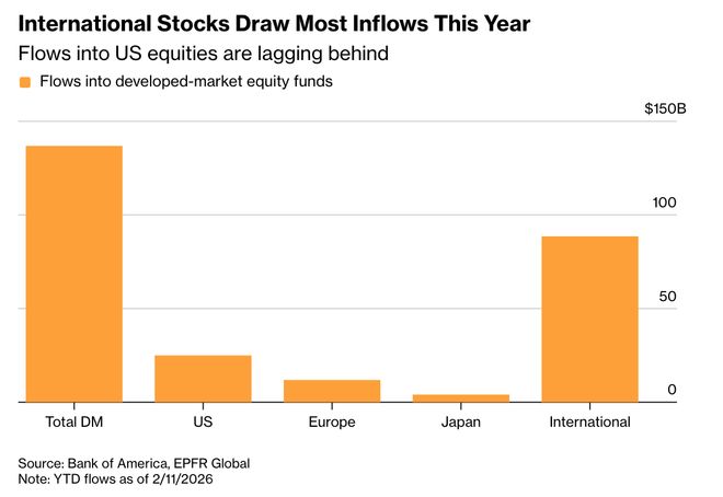 美国贸易政策与全球资产再平衡 - 美国贸易政策正在创造一个“新世界秩序”,投资者正从美元和美国股票转向非美资产[1] - 特朗普政府的“让经济过热”政策意味着新的“除了美元之外的一切”交易,美国例外主义正转变为全球再平衡[1] 资金流向与市场表现 - 今年流入欧洲、日本及其他国际发达市场股票基金的资金合计达1040亿美元,远高于流入美国股票基金的250亿美元[1] - 自2024年底以来,标普500指数上涨15%,但落后于MSCI全球指数(除美国外)39%的涨幅[4] - 2026年以来欧股、日股、韩股、新兴市场指数集体跑赢美股[4] - 1月投资者向国际股票交易所交易基金净流入516亿美元,自2024年底以来月度资金流入量大幅跃升[4] 非美资产的投资逻辑 - 非美股票将得到提振,其中新兴市场的大宗商品生产国有望受益于人工智能需求的增长[1] - 投资者对中国和印度的配置仍然不足[1] - 美元走软是海外市场投资吸引力上升的重要推手,美元较2022年高点下跌约10%,提升了海外企业盈利的相对价值[4] - 衡量美元表现的指标自2024年底以来已下跌10%[4] 机构观点与配置调整 - 多数机构认为美股将继续引领全球股市走高,但领先优势不会像近几年那么巨大[5] - 有机构表示应开始减持美股、进行再平衡,采取更均衡的配置方式[6] - 投资者对美股的“单一执念”正在拓宽,开始关注国际多元化配置[6] - 在人工智能投资热潮推动美股连续三年大幅上涨后,交易者开始在其他地方寻找下一波上涨机会[6] 市场内部轮动 - 美股内部的领涨板块发生轮换,美股小盘股和蓝筹股近期跑赢了主要基准指数[6] - 受益的不只是海外股市,美股内部也存在结构性机会[6]