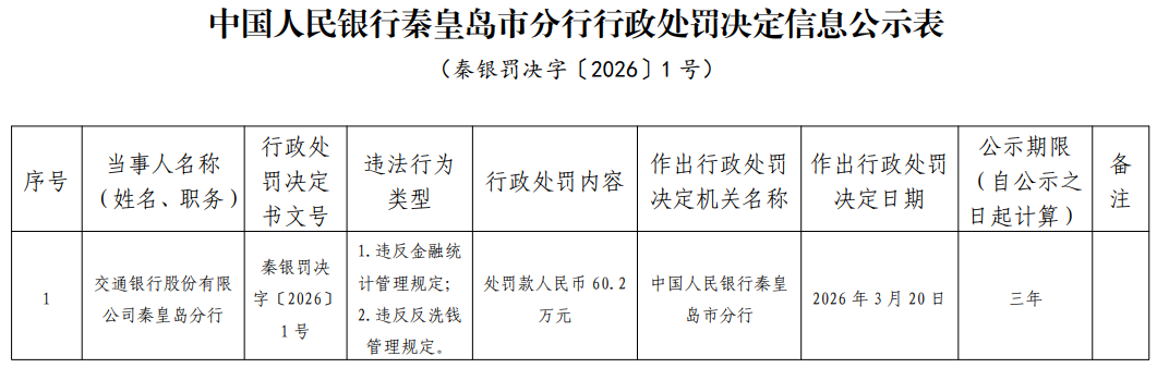 监管处罚事件 - 交通银行股份有限公司秦皇岛分行因两项违规行为受到中国人民银行秦皇岛市分行的行政处罚[1] - 具体违规行为包括违反金融统计管理规定以及违反反洗钱管理规定[1][2] - 监管机构对该公司处以罚款人民币60.2万元[1][2] 处罚详情 - 行政处罚决定书文号为秦银罚决字〔2026〕1号[2] - 处罚决定由中国人民银行秦皇岛市分行于2026年3月20日作出[2] - 该处罚信息的公示期限为三年[2]