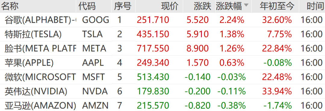 大家早上好!昨夜今晨,又有很多大事发生。 美国三大股指收盘涨跌不一,中概股整体跑赢大盘。 美联储发表《褐皮书》称,劳动力需求不旺,价格进一步上涨。美联储10月降息概率高达97.3%! 【导读】美联储《褐皮书》:劳动力需求不旺 价格进一步上涨 临时拨款法案再次未获推进,美国联邦政府"停摆"影响美联储决策。 美国三大股指收盘涨跌不一 美国三大股指收盘涨跌不一,道指跌0.04%报46253.31点;标普500指数涨0.4%报6671.06点;纳指涨0.66%报22670.08点。 霍尼韦尔国际跌近3%,旅行者集团跌超2%,领跌道指成份股。 大型科技股多数上涨,美国科技七巨头指数涨0.59%,谷歌涨2.24%,特斯拉涨1.38%,脸书涨1.26%。 | 代码 现价 涨跌 涨跌幅▼ 年初至今 时间 名称 | | --- | | 谷歌(ALPHABET)-1 GOOG 1 251.710 5.520 2.24% 32.60% 16:00 | | 特斯拉(TESLA) 7.75% 16:00 | | 脸书(META PLATF META 3 717.550 8.900 1.26% 22.84% 16:00 | | 苹果(A ...