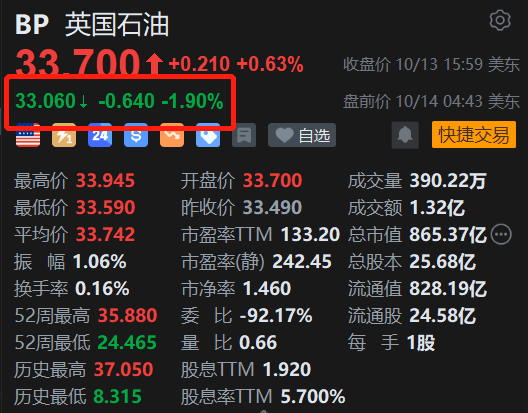 | BP 英国石油 | | | | --- | --- | --- | | 33 700 + +0.210 +0.63% | | 收盘价 10/13 15:59 美东 | | 33.060 + -0.640 -1.90% | 盘前价 10/14 04:43 美东 | | | 三 71 24 15 × × 日 ♥ 白 一 白 一 白 一 白 一 | ● 快捷交易 | | | 最高价 33.945 | 成交量 390.22万 开盘价 33.700 | | | 最低价 33.590 | 昨收价 33.490 成交额 1.32亿 | | | 平均价 33.742 | 市盈率TIM 133.20 总市值 865.37亿 (m) | | | 振 幅 1.06% | 市盈率(静) 242.45 总股本 25.68亿 | | | 换手率 0.16% | 市净率 1.460 流通值 828.19亿 | | | 52周最高 35.880 | 委 比 -92.17% 流通股 24.58亿 | | | 52周最低 24.465 | 色 主 1股 量 比 0.66 | | | 历史最高 37.050 | 股息TTM 1.920 | | ...