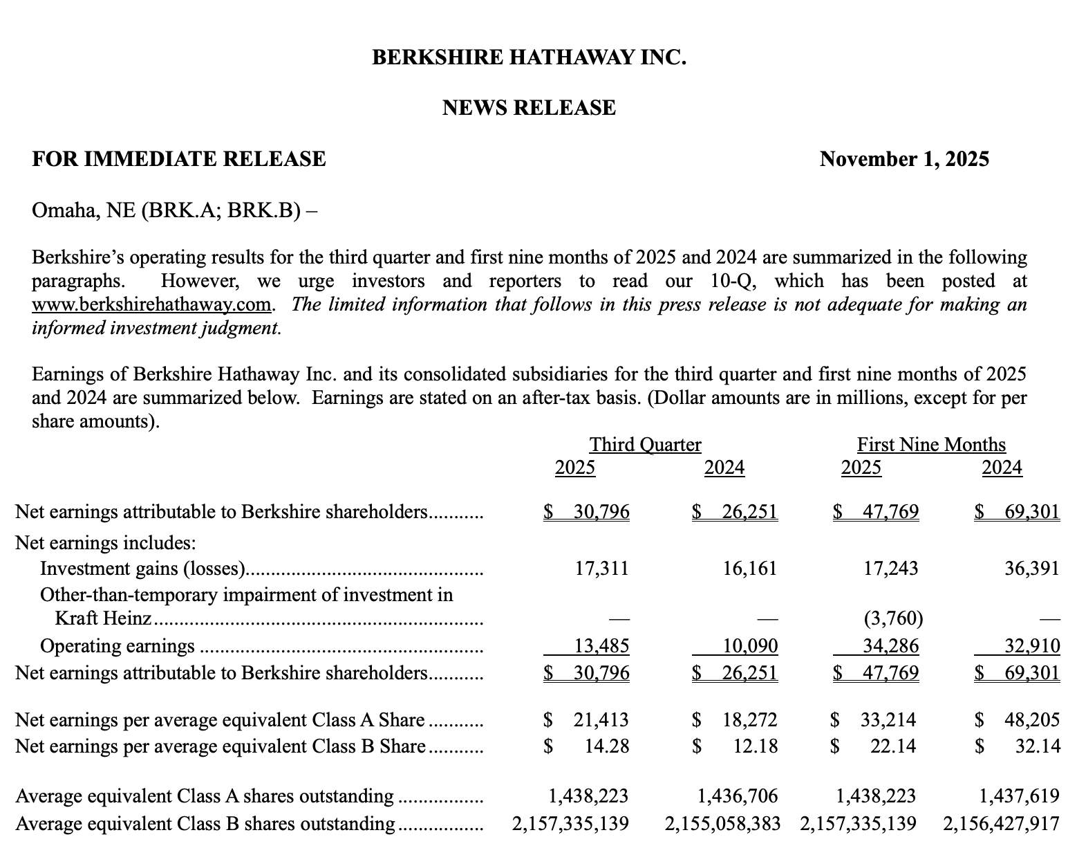 | | Third Quarter | | | --- | --- | --- | | | 2025 | 2024 | | Net earnings attributable to Berkshire shareholders | ee 30,796 | $ 26,2 | | Net earnings includes: | | | | Investment gains (losses) | 17,311 | 16,1 | | Other-than-temporary impairment of investment in Kraft Heinz | | | | Operating earnings . | 13,485 | 10.0 | | Net earnings attributable to Berkshire shareholders | မခ 30,796 | ಳ 26,2 | | Net earnings per average equivalent Class A Share | ﮭﯽ 21,413 | ಳಿ 18,2 | | Net earnings per average equivale ...